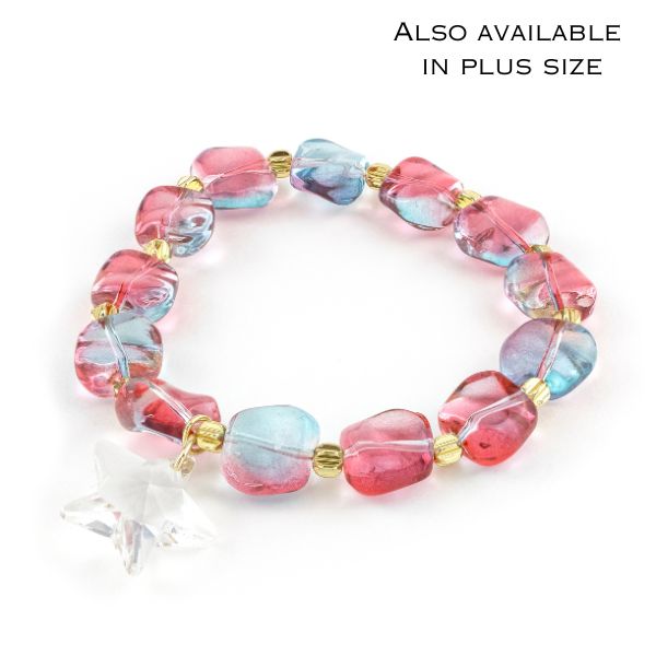 • Indulge in the luxurious beauty of our Liberty Bracelet. This unique piece showcases multi-colored red and blue faceted beads, accented with gold and a sparkling crystal star charm. Elevate any outfit with this exquisite bracelet, perfect for adding a touch of sophistication and elegance to your style.