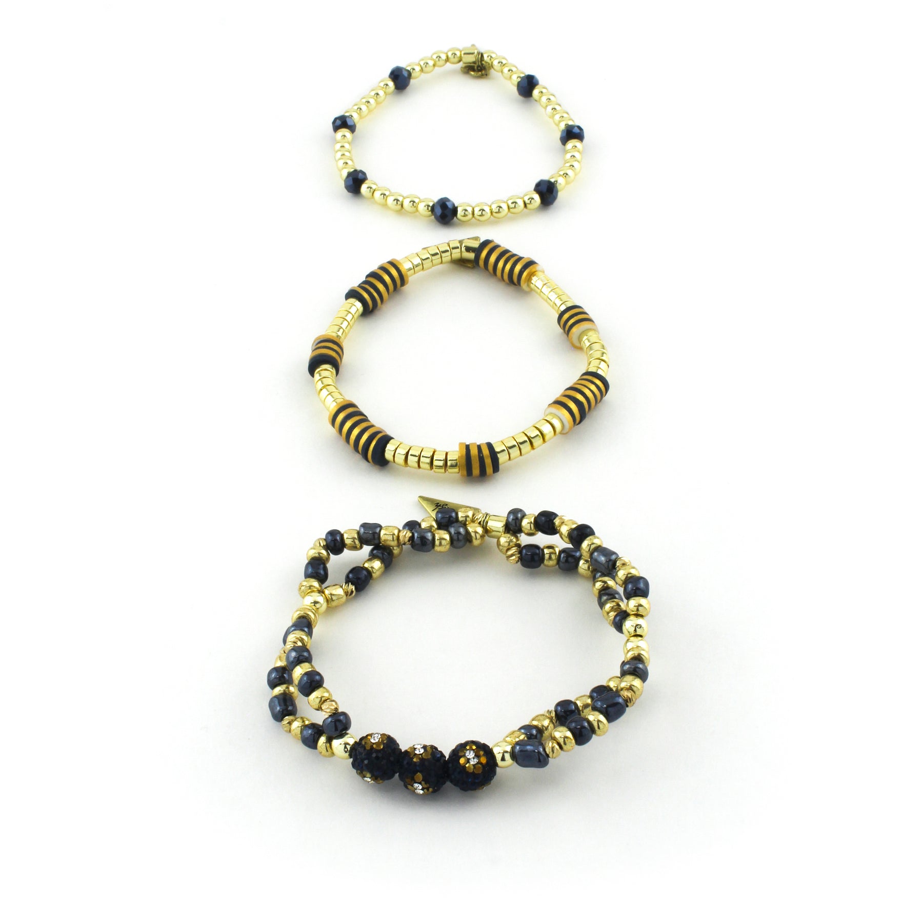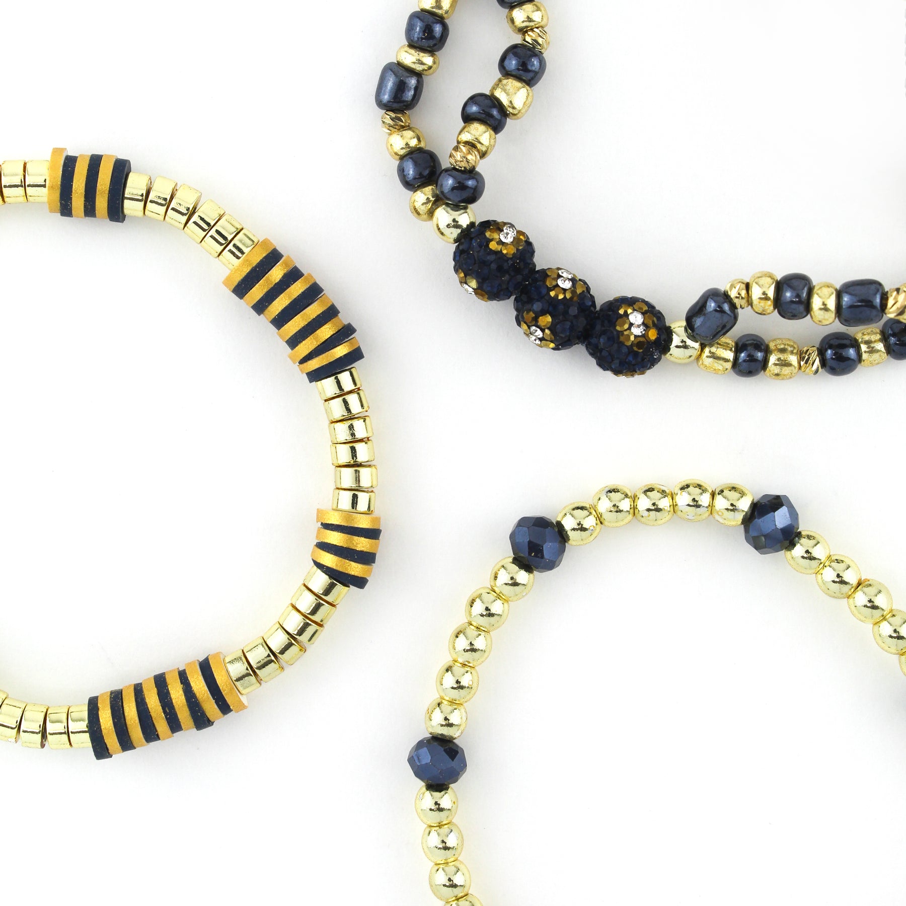 • Get ready to sparkle on gameday with the Aaron Starter Stack! This mix of navy-blue, yellow, and gold detailed beads, along with a fun leopard shamballa, will add a touch of playfulness to your game day look. Don't miss out on this unique and quirky stack!