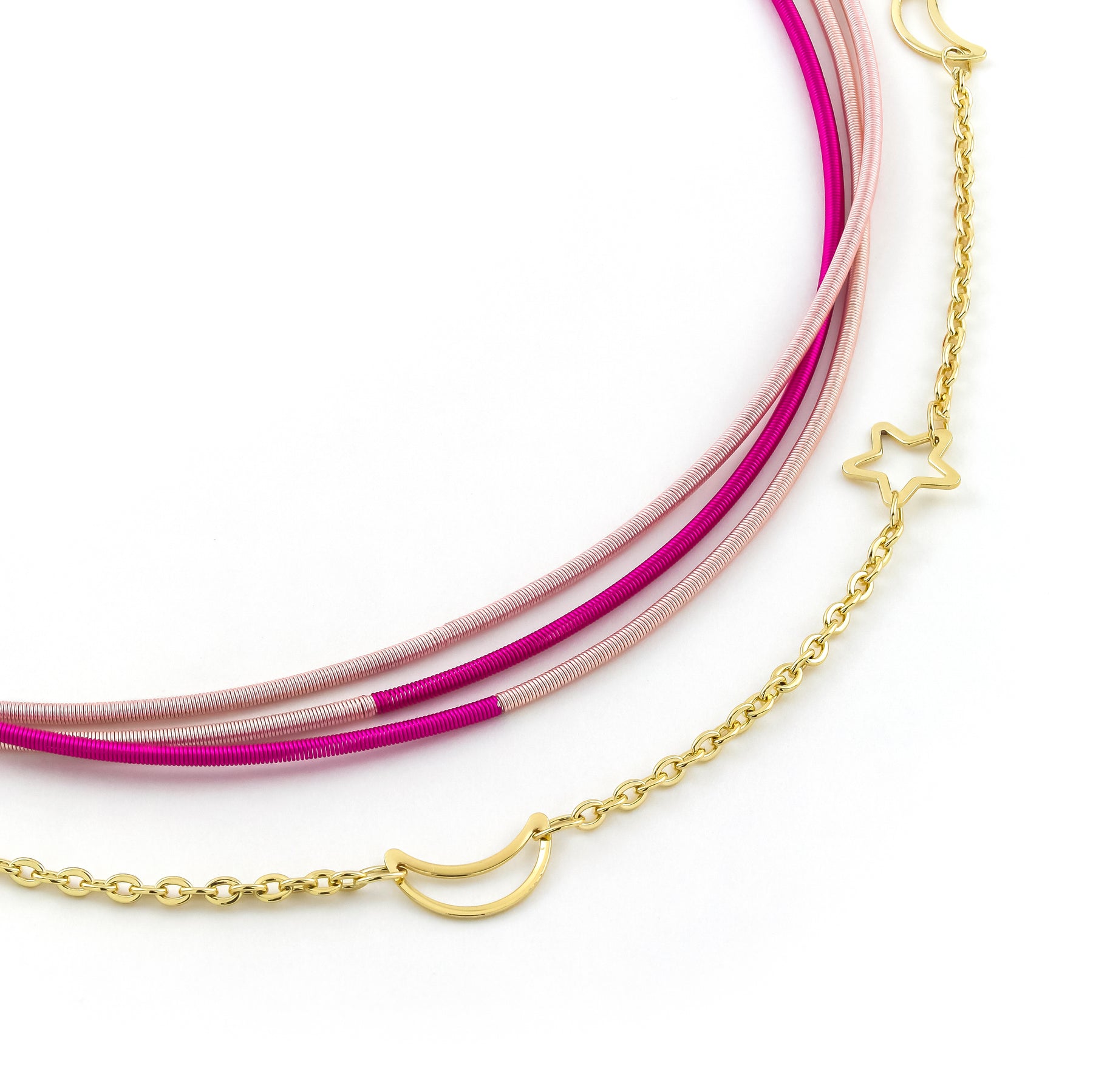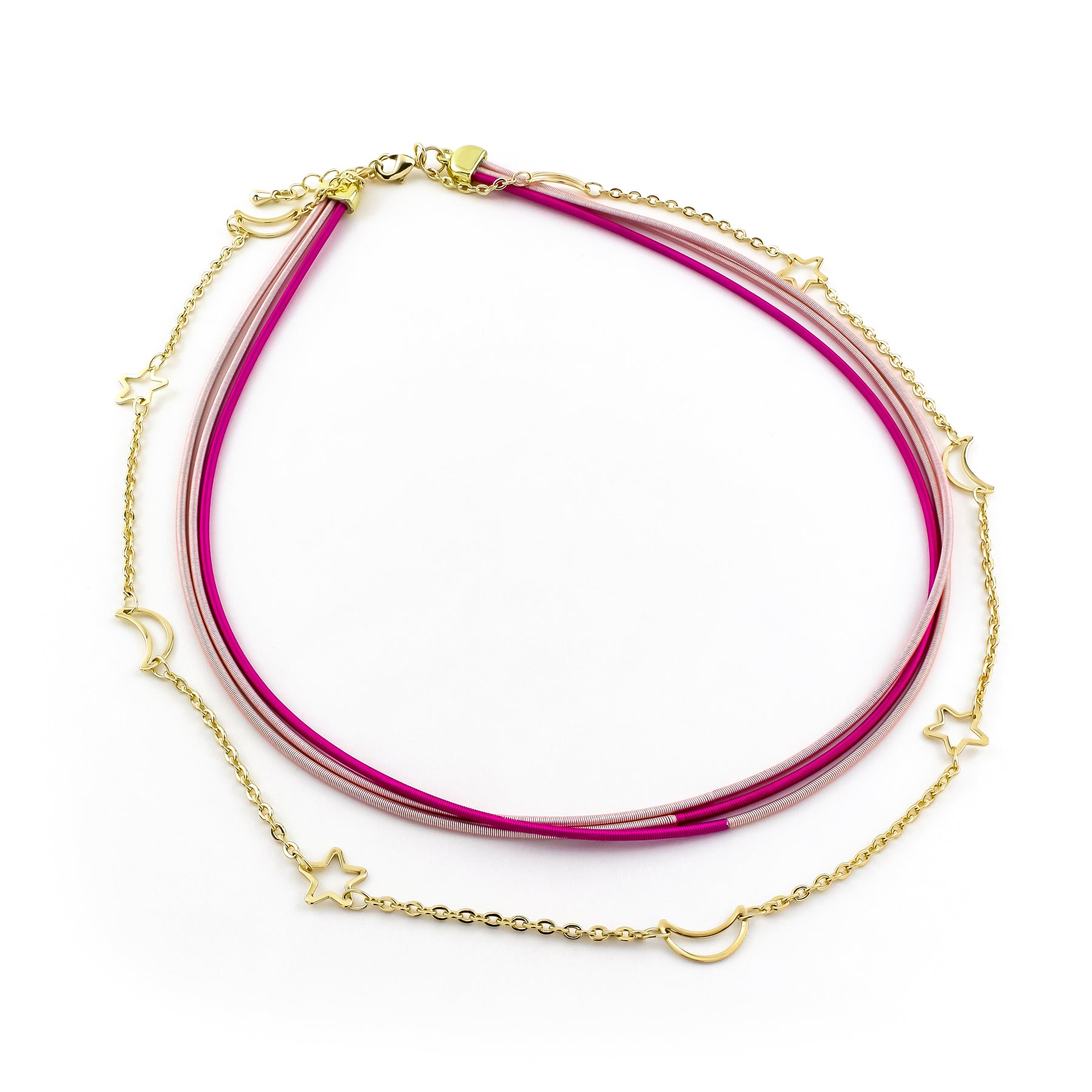 • "Shine bright like the night sky with our Moon & Stars Necklace! This layered necklace features moon & star accents, adding a touch of celestial charm. The multi pink strands will add a playful pop of color to any outfit. Embrace your inner stargazer with this unique necklace!"