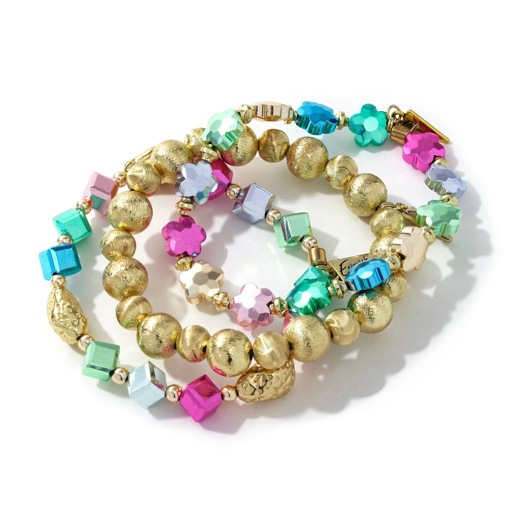 • Introducing the Bradshaw Starter Stack in a metallic blue, pink and teal with gold accents! This set is perfect for those looking to stand out from the crowd. With its unique color and luxe detailing, you'll be sure to make a statement wherever you go. Start your day off with a touch of fun and style.