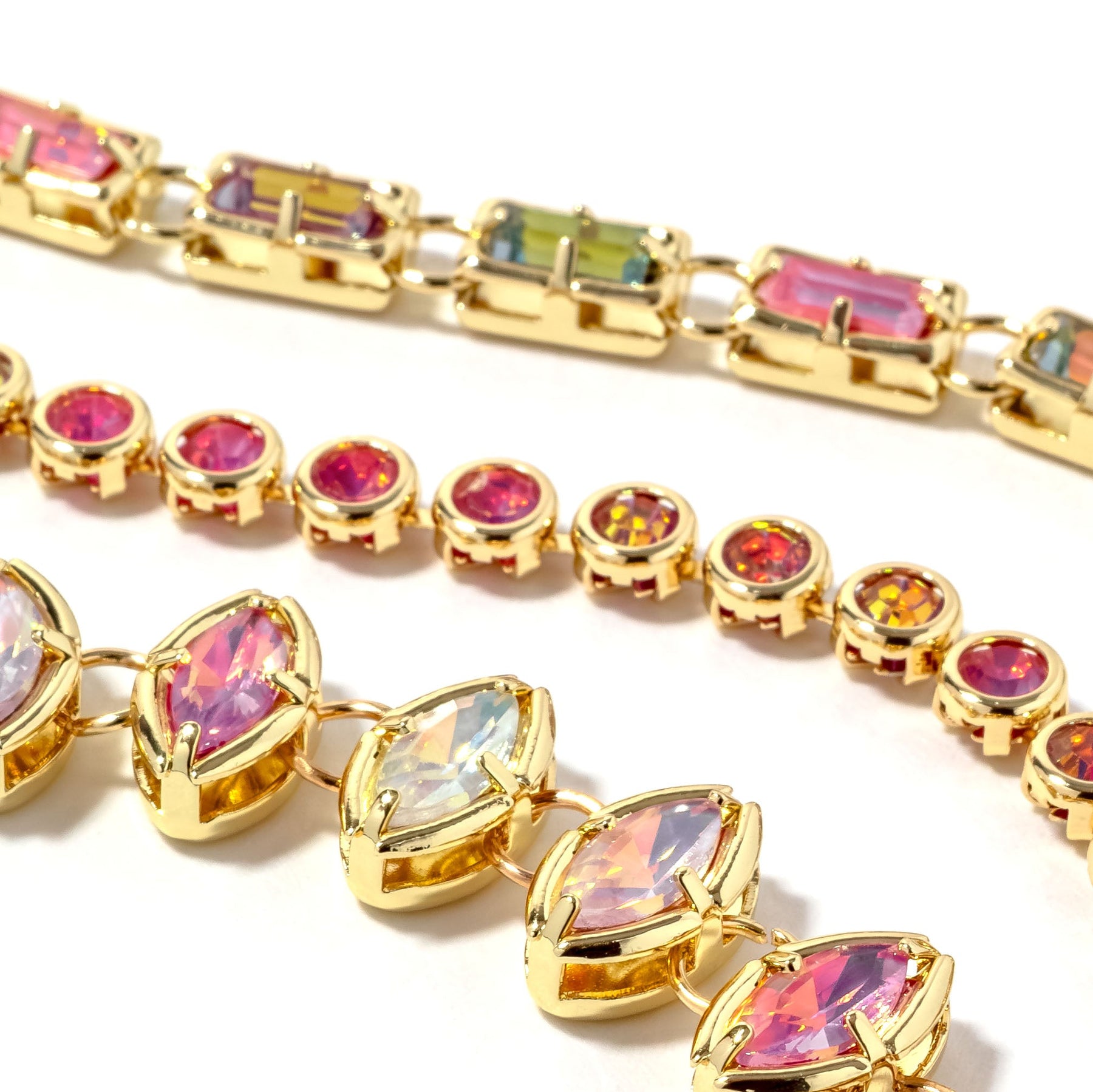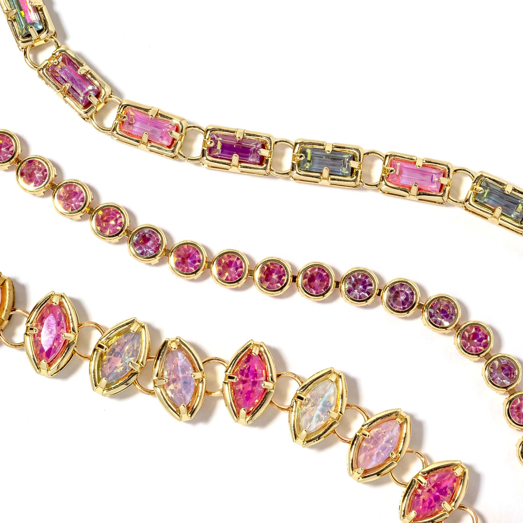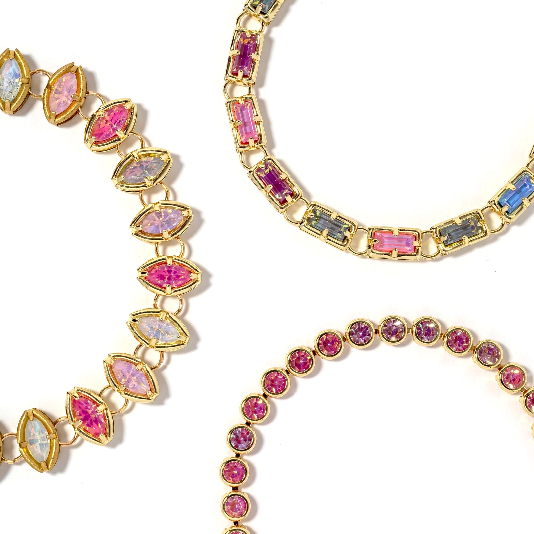 • Layer elegance with the Hollis Stack, a refined three-piece bracelet collection in soft pink tones. Each piece features radiant crystal stones set in gold plating, designed to wear together or separately for versatile styling. The interplay of light across the faceted stones creates a luminous effect that elevates any look with understated luxury.