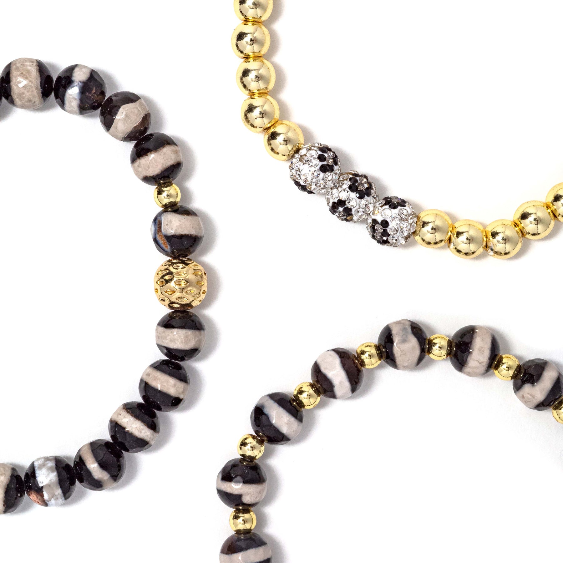 • Meet your new go-to arm candy: the Luxe Rae Stack. This sleek trio combines polished black bracelets with natural stone accents and shimmering Shamballa details that catch the light just right. Mix textures and finishes for an effortlessly cool vibe, or keep them stacked for serious wrist presence.