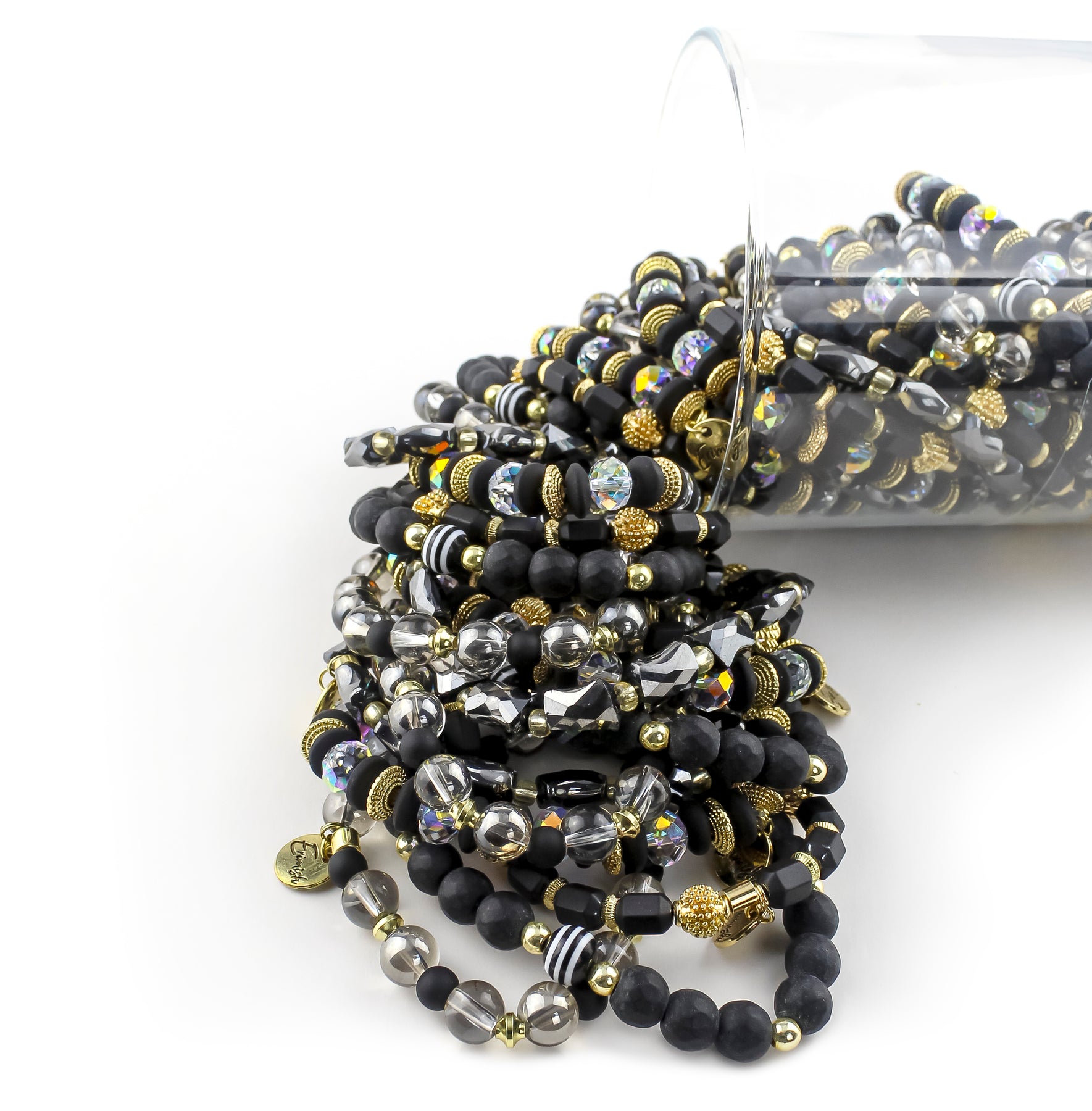 • The Barcelona Jar is perfect with its striking black and gold aesthetic. Elevate your collection with these stunning piece that combines sleek black with luxe gold accents. This coveted bracelet stack delivers serious style with its bold, sophisticated aesthetic. Perfect for stacking, layering, or making a statement on its own, it's the accessory that transforms any look from ordinary to extraordinary. Grab yours before they're gone!