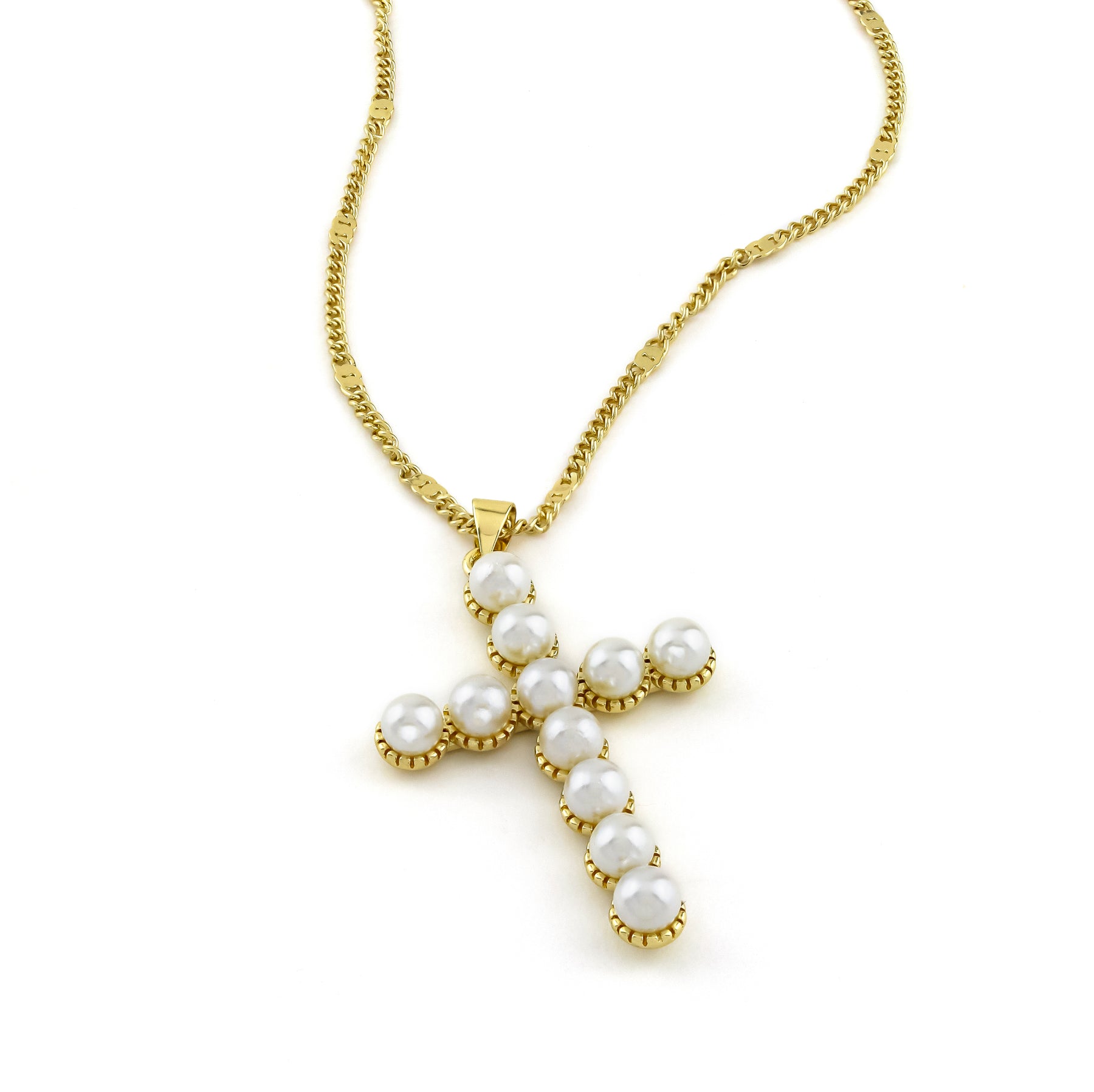 • Add some sparkle to your outfit with this playful gold necklace. The simple chain is adorned with a pearl adorned cross pendant, making a statement while keeping it simple. Perfect for adding a fun touch to any outfit.